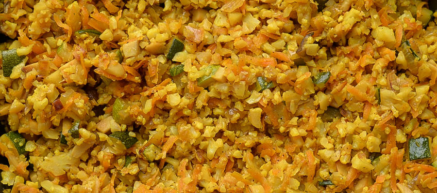 Zutaten Blumenkohl 1x – auf Reisgröße zerkleinern Zwiebel 1x – würfeln Pilz z.B. Shiitake 120g – würfeln Zucchini 1x – würfeln Karotte 1x – raspeln Knoblauchzehe 2x – pressen Ingwer 1/2 TL – raspeln Kurkumapulver 1/2 TL Kokos Aminos Würzsauce (Soja Alternative) 3 EL Kokosöl 2 EL Himalayasalz & Pfeffer Zubereitung Zwiebel in Kokosöl andünsten Pilze, Zucchini & Karotten dazu geben und leicht braun anbraten Knoblauch, Ingwer und Kurkumapulver dazu geben und kurz mit anbraten. ...