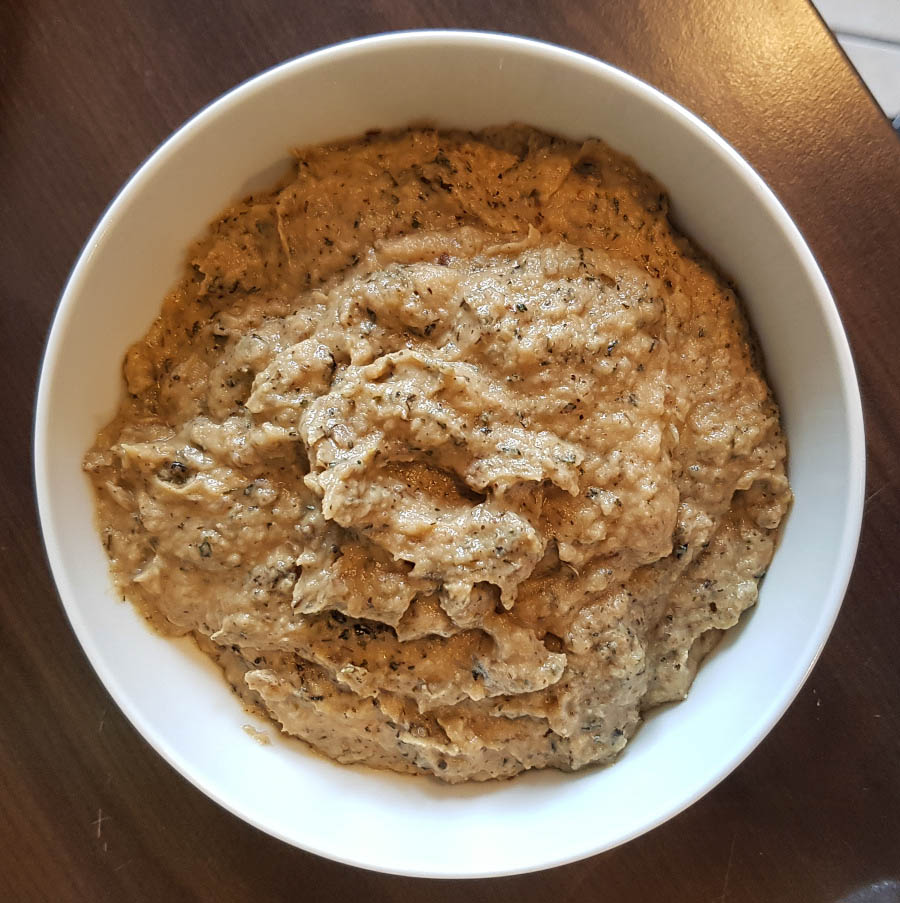 Zutaten Aubergine 1Kg (würfeln) Zwiebeln 3x (würfeln) Knoblauchzehe 6x (pressen) Minze (getrocknet) 3EL (zerkleinern) Olivenöl Himalayasalz Zubereitung Auberginen mit Olivenöl beträufeln, auf ein Backblech geben und leicht braun anbraten/backen. Parallel dazu die Zwiebeln in Olivenöl leicht braun anbraten. Knoblauch & getrocknete Minze zu den Zwiebeln geben und kurz mit anbraten. Alle Zutaten mit einem Pürierstab fein pürieren. Mit Himalayasalz abschmecken. Kein Pfeffer. Info Ich verwende die Auberginensorte: Violetta di Firenze.