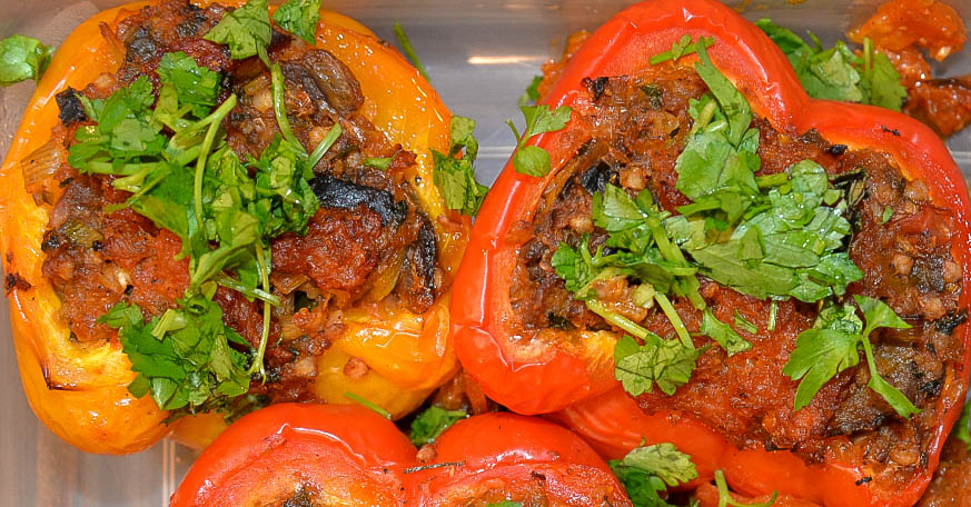 Zutaten (Paprika & Füllung) Paprika 4x – halbiert Aubergine 1x – gewürfelt Tomaten 2x – gewürfelt Zwiebel 1x – gewürfelt Knoblauchzehe 2x – fein gewürfelt Lauch 1x – zerkleinert Frühlingszwiebeln 1/2 Bund – zerkleinert Petersilie 1/2 Bund – zerkleinert Buchweizen 8EL Tomatenmark 1EL Koriandersamen 3TL – gemahlen Wasser 100ml Himalayasalz & Pfeffer Olivenöl Zutaten Tomatensauce Tomaten 2-3x – gewürfelt Zwiebel 1x – gewürfelt Knoblauchzehe 2x – fein gewürfelt Tomatenmark 1EL Koriandersamen 3TL – gemahlen Wasser 500ml Himalayasalz & Pfeffer Olivenöl Zubereitung Tomatensauce ...