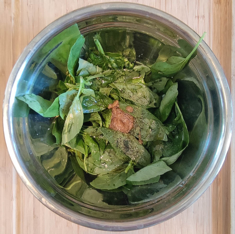 Basilikum, Spinat, Zitronensaft, Olivenöl, Dattelmus, Himalayasalz & Pfeffer mit einem Pürierstab pürieren.