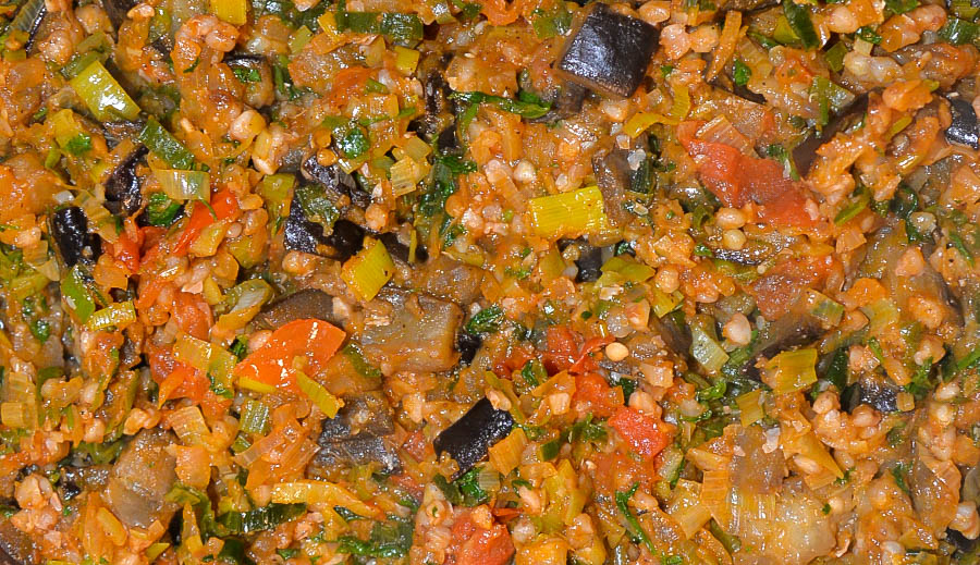Buchweizen dazu geben und die Masse ein paar Min. köcheln, bis die Flüssigkeit eingezogen wurde.