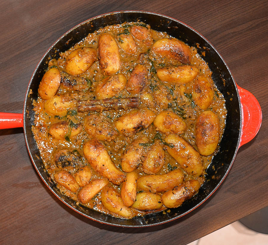 Kartoffeln, Asant & Kashmiri Chilipulver dazu geben und die Mischung bei geringer Temperatur solange köcheln, bis die Kartoffeln durch sind und die Sauce reduziert wurde.