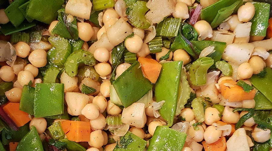 Kichererbsen, Kichererbsenwasser, Mangold, Minze & Koriander zu der Mischung geben und für ca. 20 Min. bei mittlerer Temperatur köcheln.
