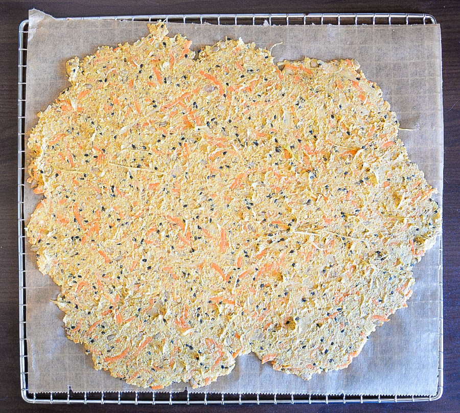 Die Mischung anschließend im Backofen oder im Dörrautomat bei 40 Grad Celsius trocknen. Die Trocknung dauert im Dörrautomat zwischen 14h und 20h. Das Brot sollte nicht feucht sein, da ansonsten leicht Schimmel entstehen kann.