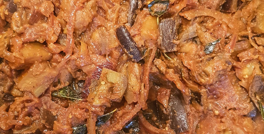 Zwiebeln dazu geben und beide leicht braun anbraten bzw. bis die Auberginen durch sind.