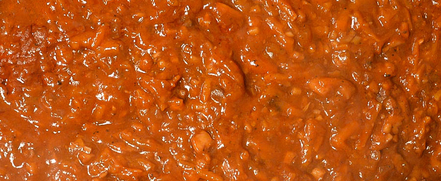 Tomatensauce, Wasser, Dattenmus und Lorbeerblätter dazu geben und 45 Min. bei geringer Hitze köcheln.